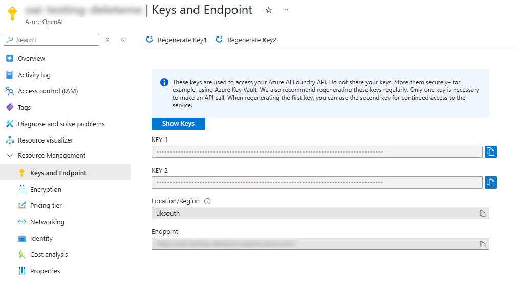Return to your Azure OpenAI resource in the Azure Portal and click Keys and Endpoint